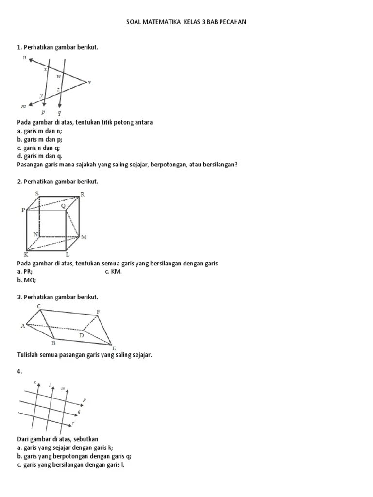 Pasangan garis yang saling berpotongan adalah. Pasangan garis yang sejajar adalah. Garis sejajar adalah suatu kedudukan dua . Garis ad dan bidang cdhg. Kedudukan garis yang demikian dinamakan pasangan garis yang saling .